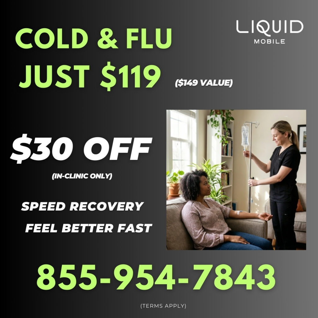 Runny nose, cough, sore throat, body aches or just feel a cold coming on? Liquid IV hydration can be one of the fastest ways to bounce back from the effects and symptoms of a cold and flu. Cold & Flu IV Hydration helps to fight against infection, improve healing time, strengthen immune system and reduces duration of illness.
